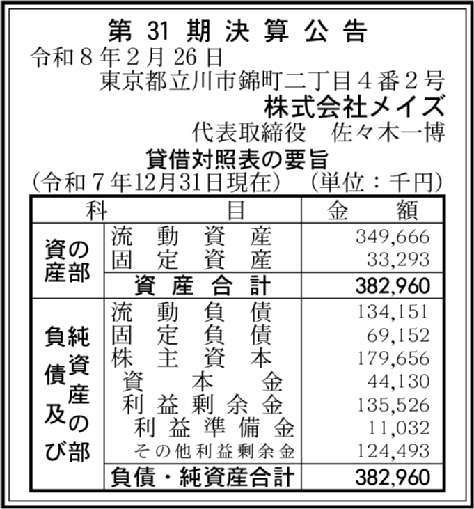 | 利益剰余金 | 1億3,552万6,000円 (▲16.84%) |