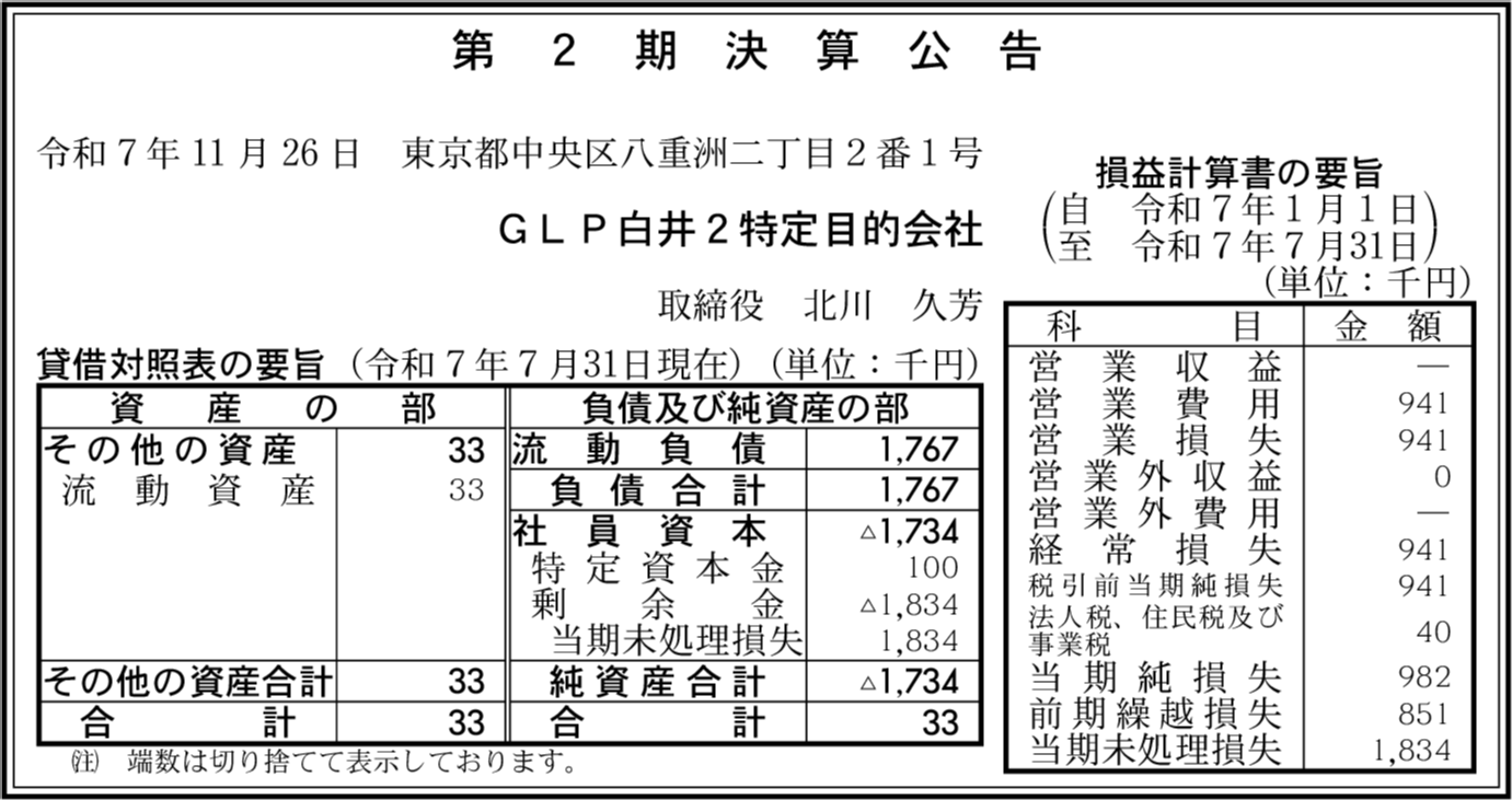 GLP白井4特定目的会社 東京都中央区 【2025年7月期】 |