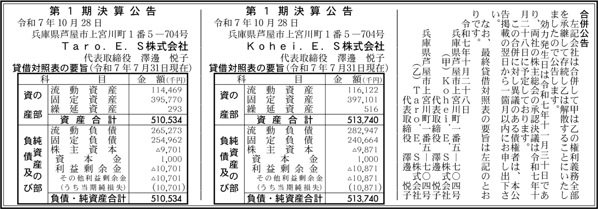 | Taro.E.S株式会社 兵庫県芦屋市 【2025年7月期】 | △1,070万1,000円 | △1,070万1,000円 | 5億1,053万4,000円 |