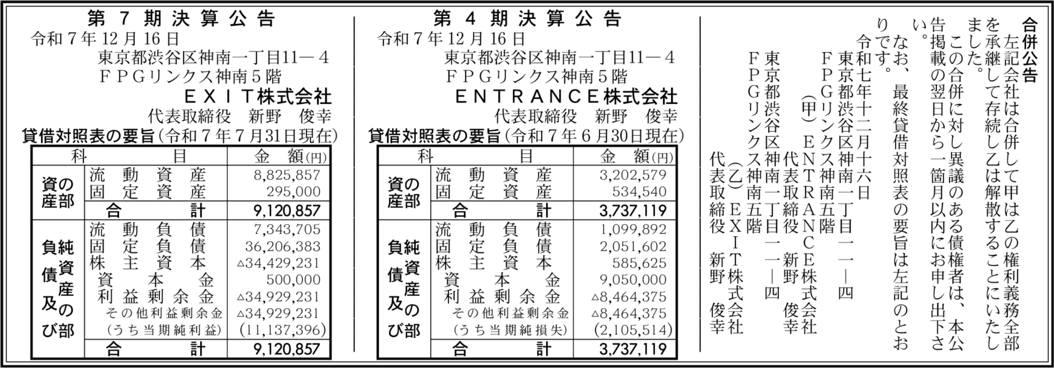 ENTRANCE株式会社 東京都渋谷区 【2025年6月期】 |