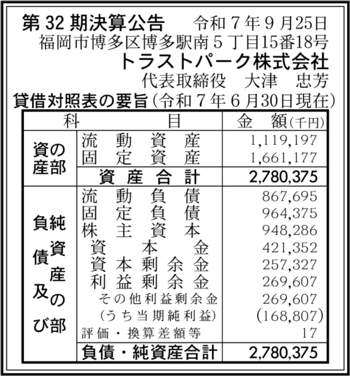 トラストアセットパートナーズ株式会社 福岡市博多区 【2025年6月期】 |