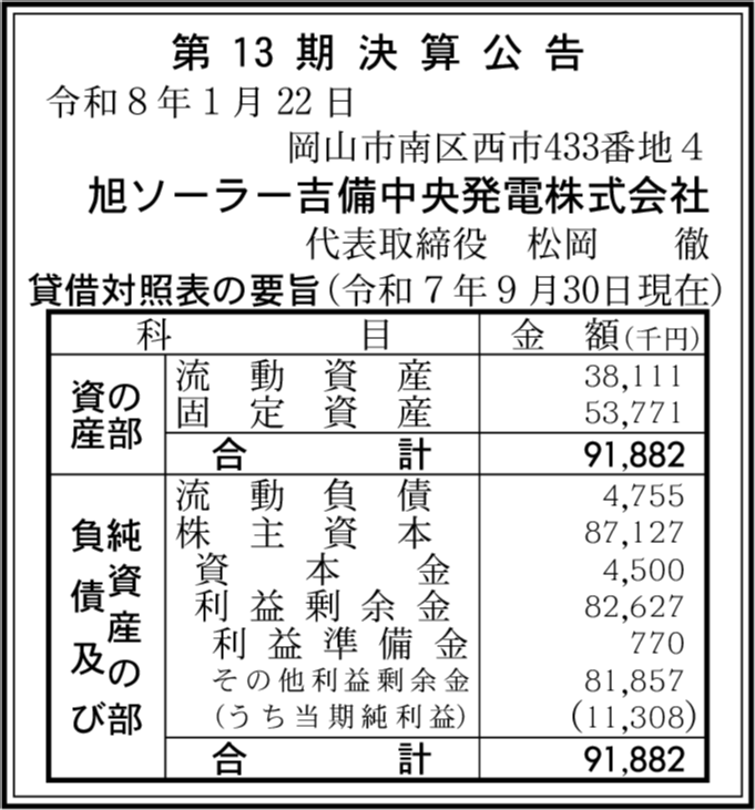 旭ソーラー総社新本発電株式会社 岡山市南区 【2025年9月期】 |
