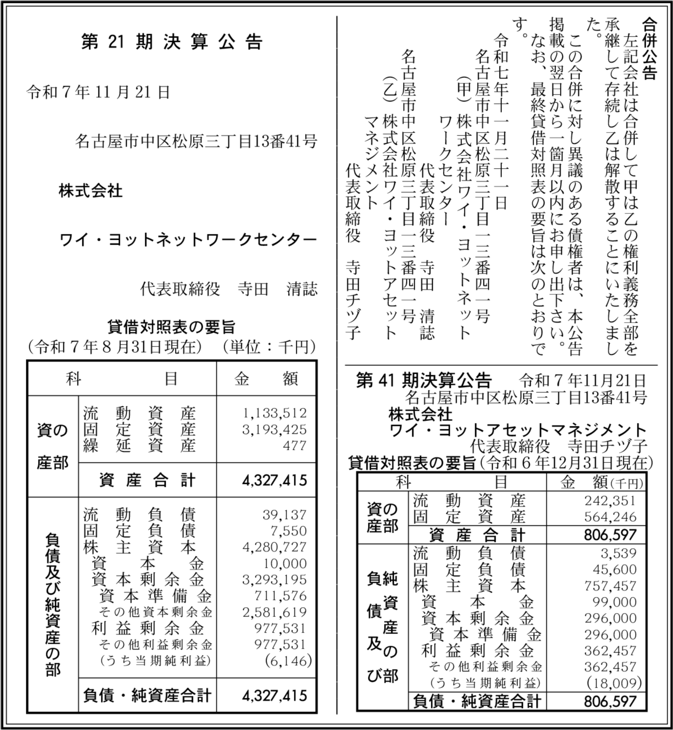 株式会社ワイ・ヨットアセットマネジメント 名古屋市中区 【2024年12月期】 |