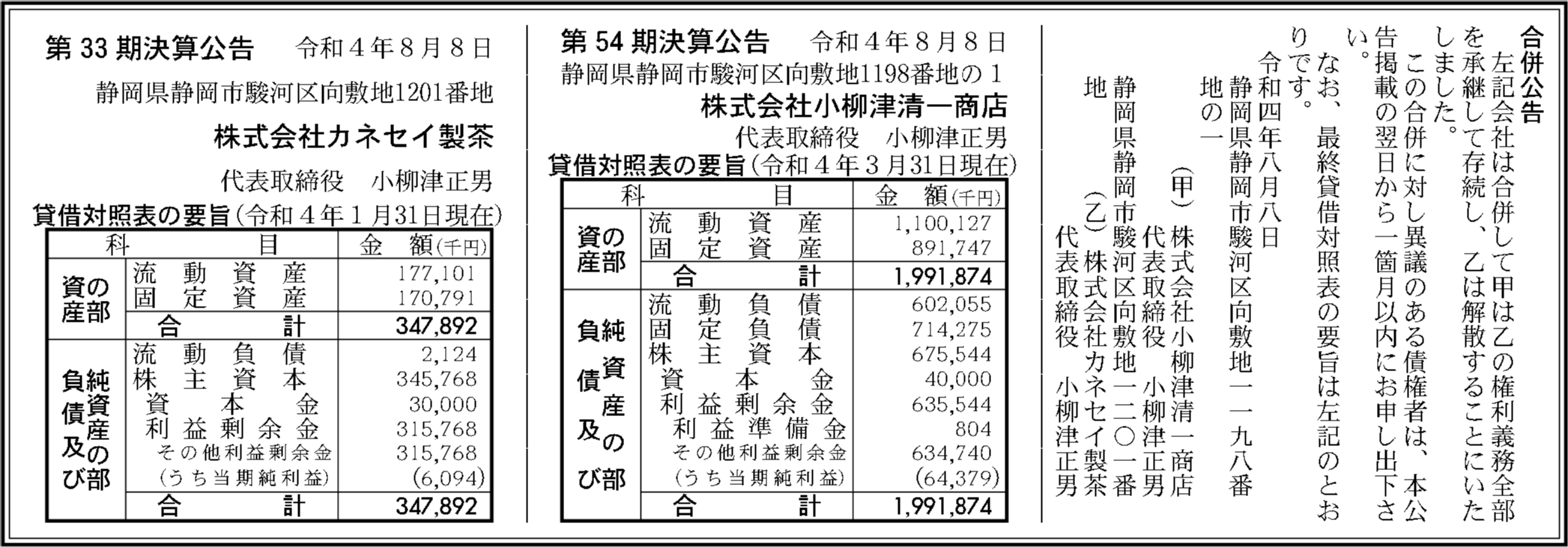 株式会社カネセイ製茶閉鎖済み 静岡県静岡市駿河区 【2022年1月期】 |