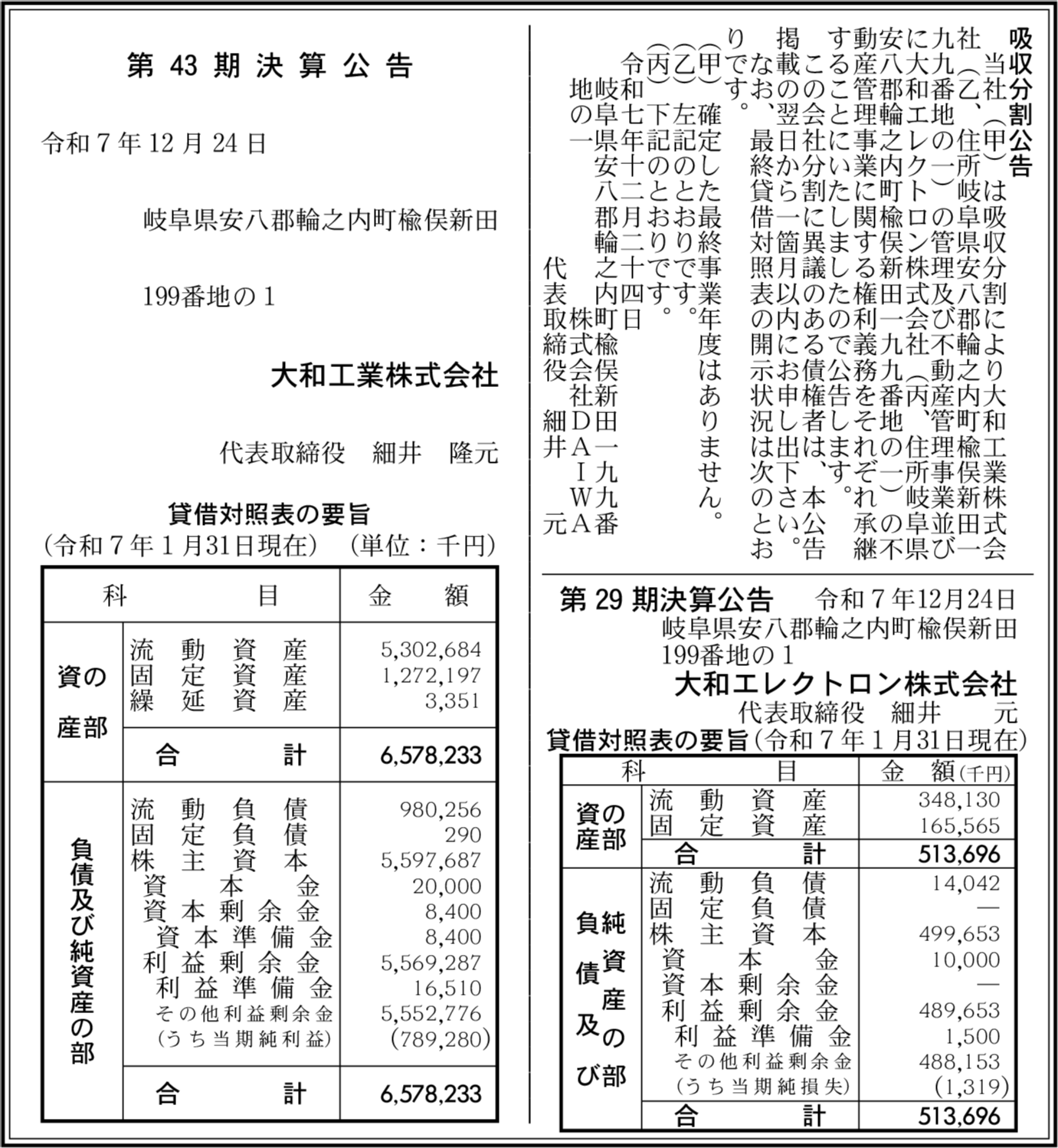 大和エレクトロン株式会社 岐阜県安八郡輪之内町 【2025年1月期】 |