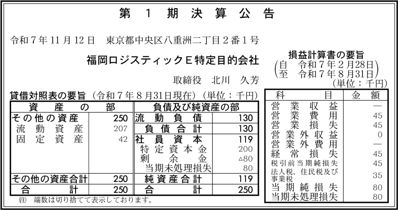 福岡ロジスティックS特定目的会社 東京都中央区 【2025年8月期】 |