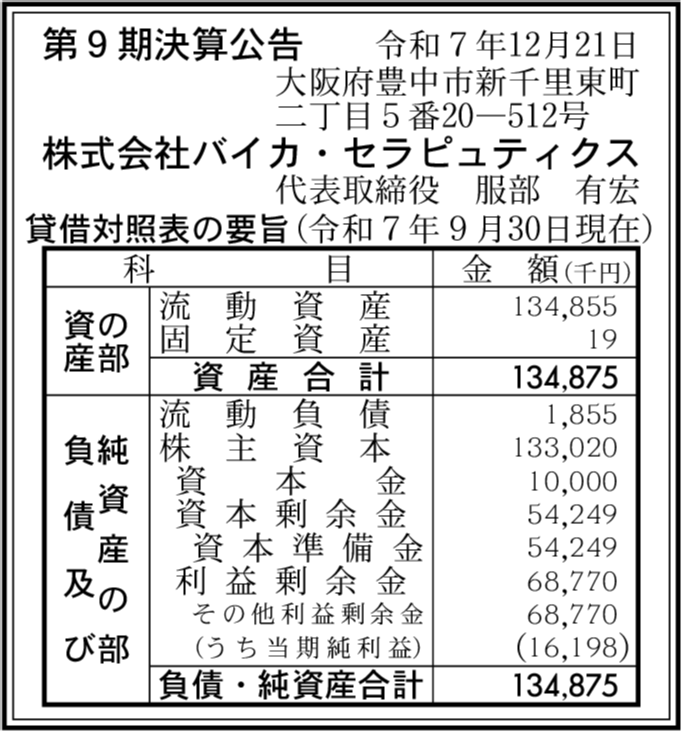 | 会社名 | 株式会社バイカ・セラピュティクス |