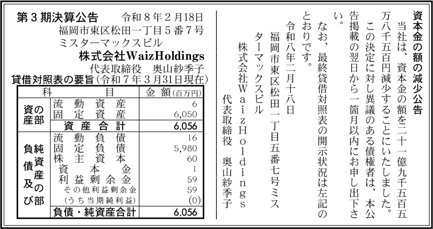| 会社名 | 株式会社WaizHoldings |