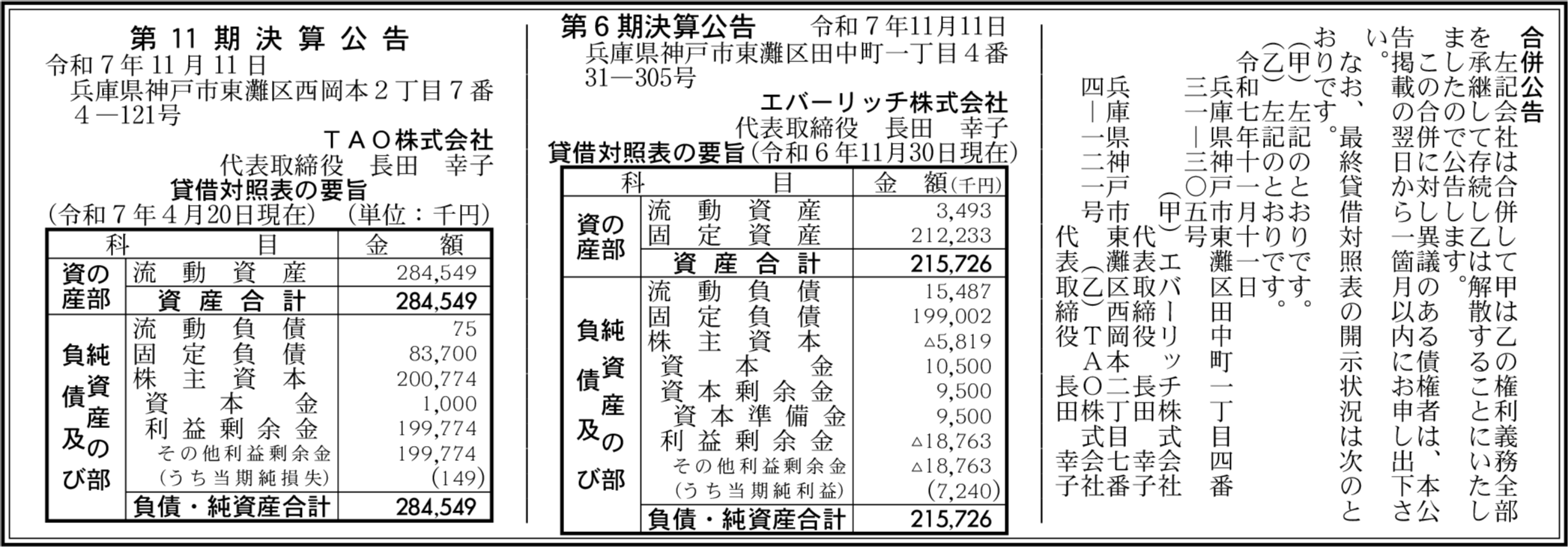TAO株式会社 兵庫県神戸市東灘区 【2025年4月期】 |