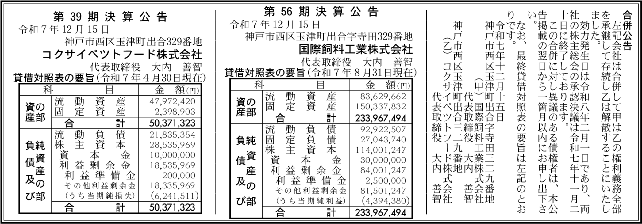 国際飼料工業株式会社 神戸市西区 【2025年8月期】 |