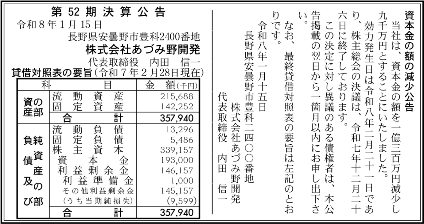 あづみ野管理株式会社閉鎖済み 長野県安曇野市 【2025年5月期】 |