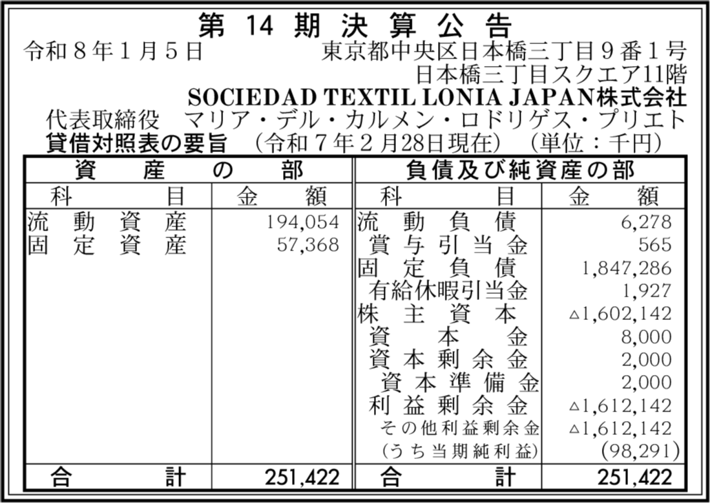 | 会社名 | SOCIEDAD TEXTIL LONIA JAPAN株式会社 |