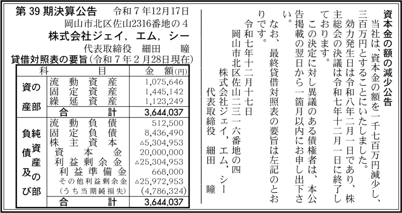 | 会社名 | 株式会社ジェイ, エム, シー |