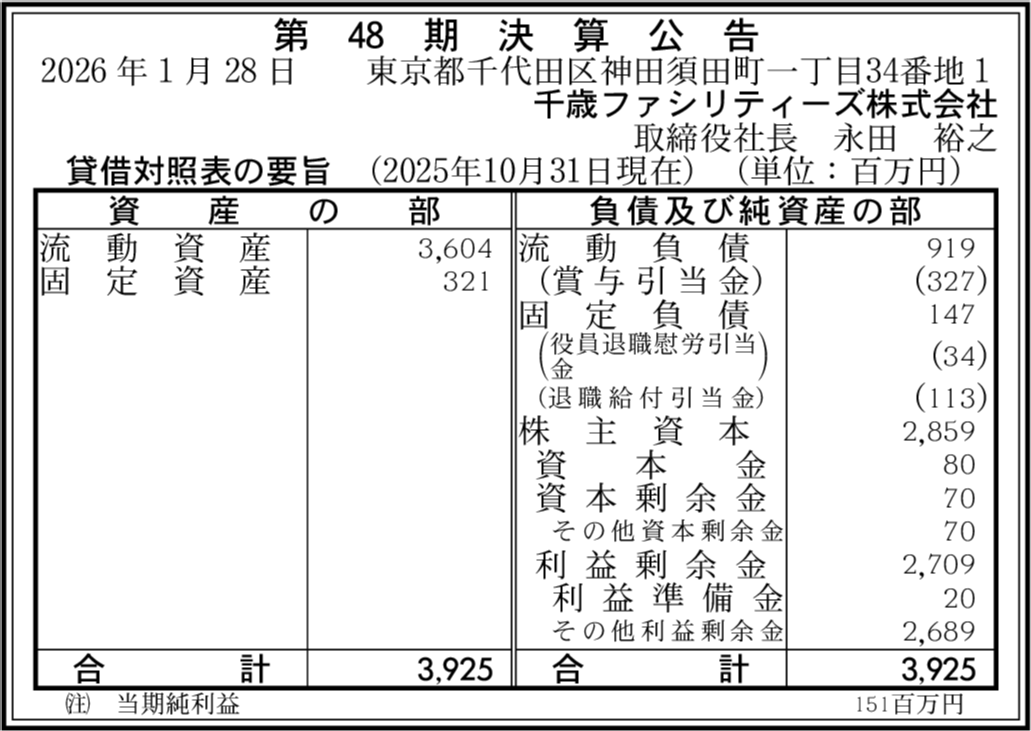 千歳コーポレーション株式会社 東京都千代田区 【2025年10月期】 |