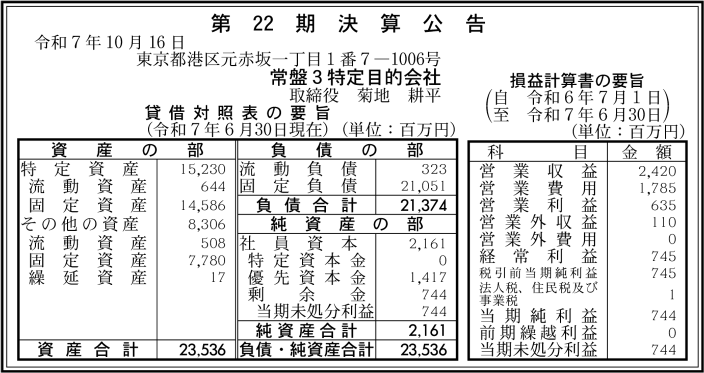 常盤1特定目的会社 東京都港区 【2025年6月期】 |