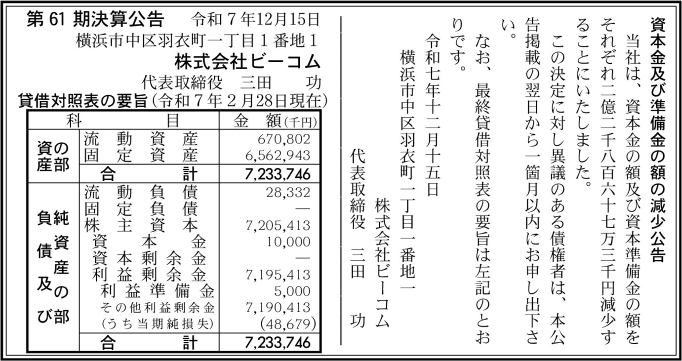 株式会社ビーコムケイ・エヌ閉鎖済み 横浜市中区 【2024年2月期】 |
