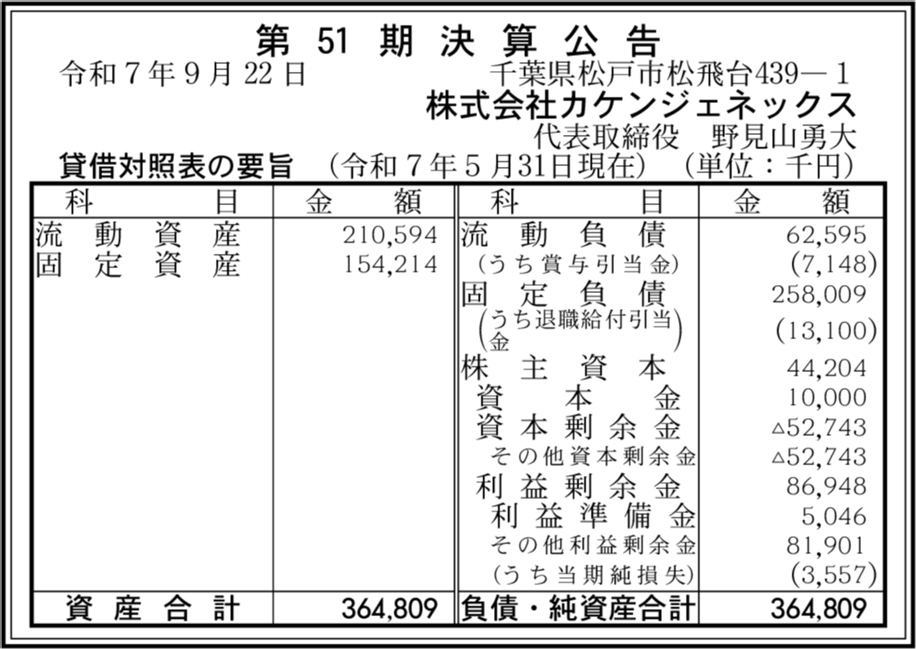 利益剰余金 | 8,694万8,000円 (▲3.93%) |