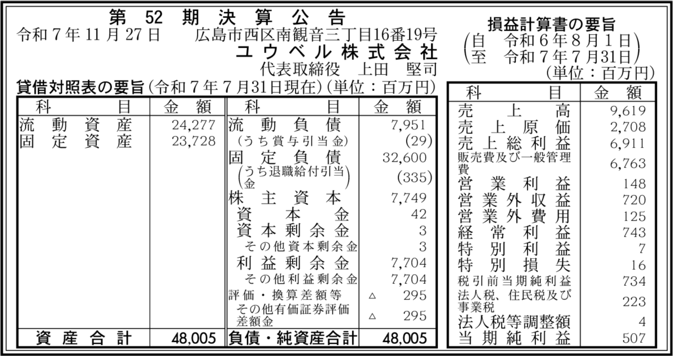 ユウベル株式会社 広島県福山市 【2025年7月期】 |