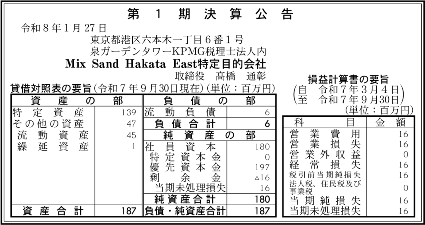 | 会社名 | Mix Sand Hakata East特定目的会社 |