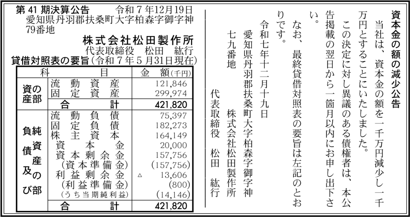 | 会社名 | 株式会社松田製作所 |