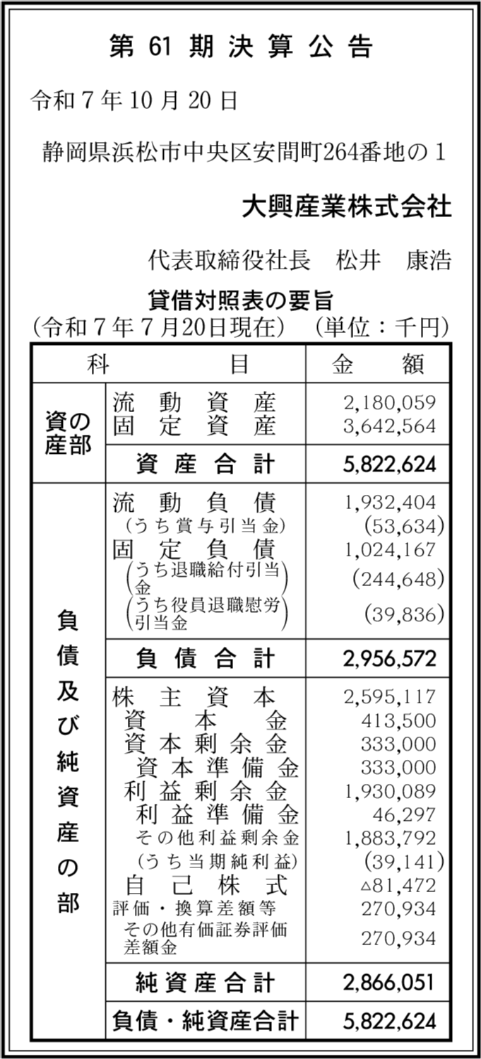総資産 | 58億2,262万4,000円 (▲3.65%) |
