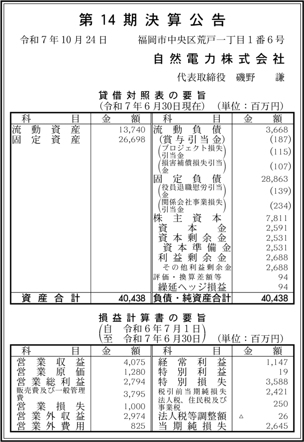 自然オペレーションズ株式会社 福岡県福岡市中央区 【2025年6月期】 |