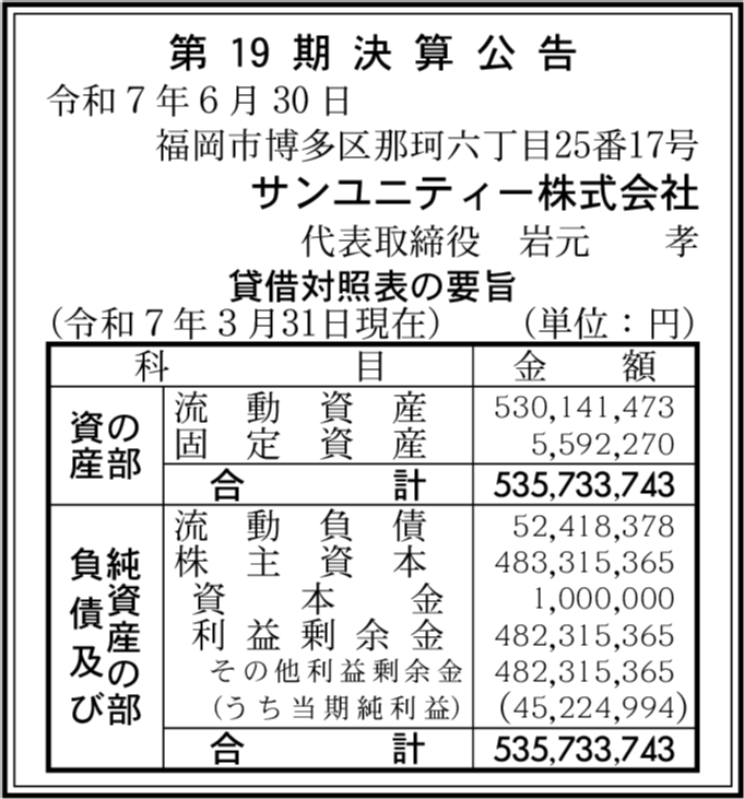 株式会社サンユニティー 福岡市博多区 【2025年3月期】 |