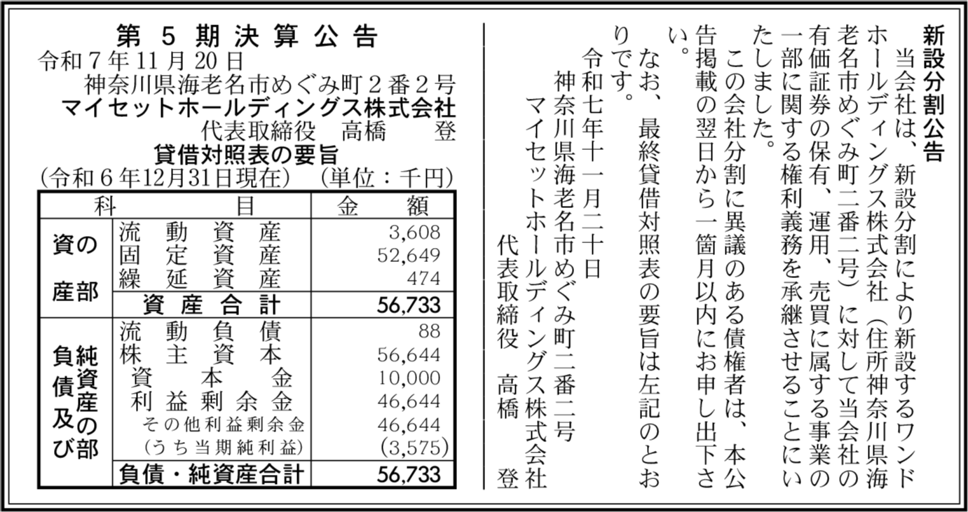 | 会社名 | マイセットホールディングス株式会社 |