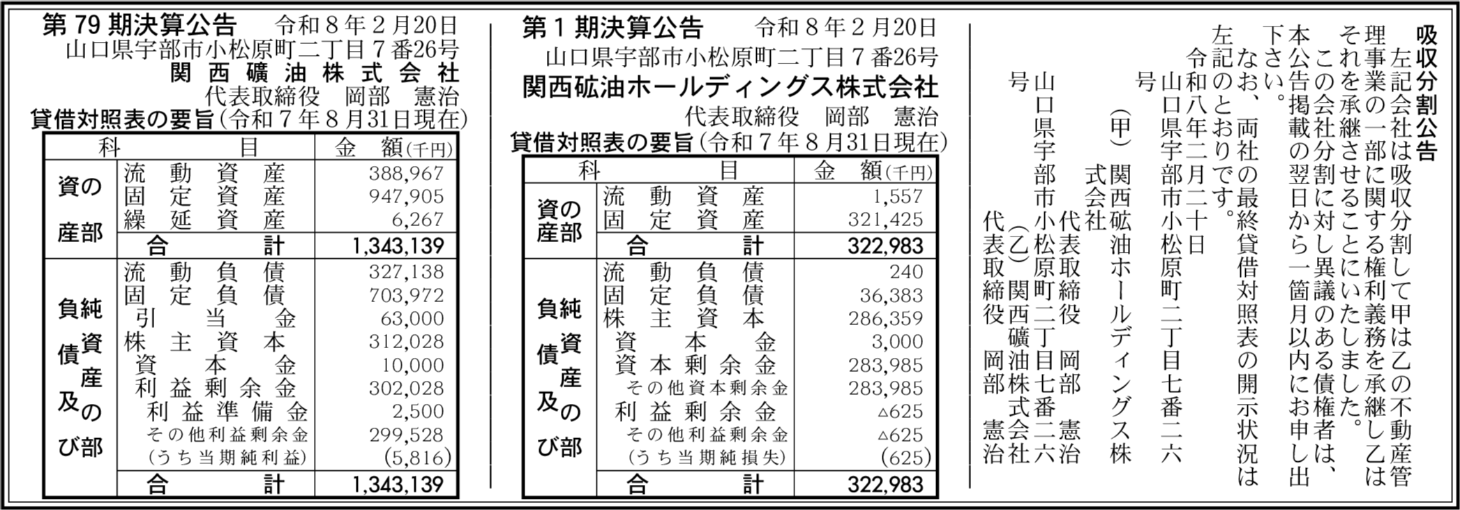 関西砿油ホールディングス株式会社 山口県宇部市 【2025年8月期】 |