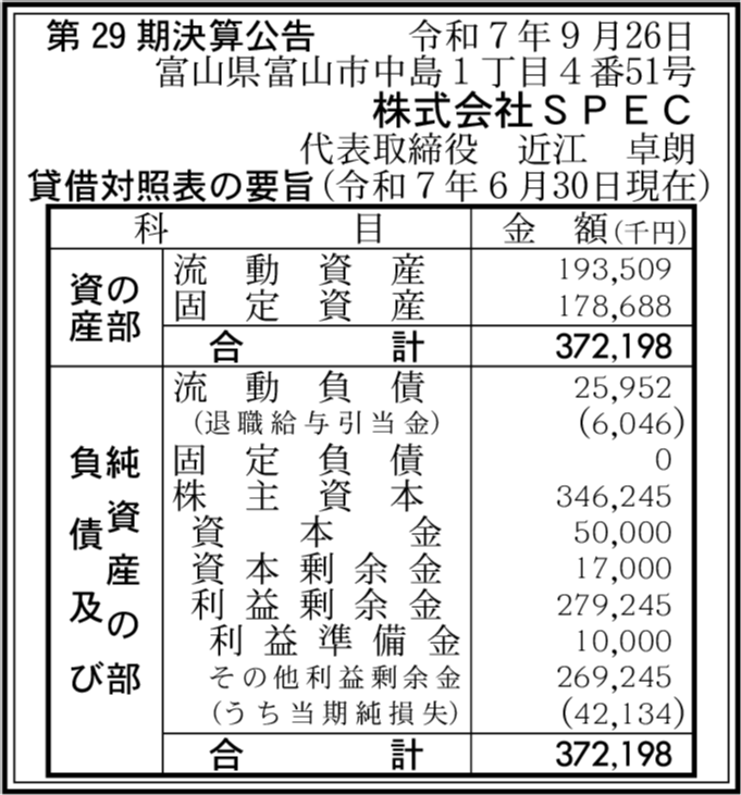 株式会社SPEC閉鎖済み 富山市 【2024年6月期】 |