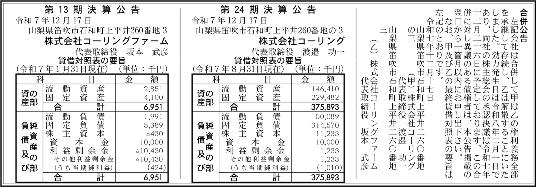 株式会社コーリングファーム 山梨県笛吹市 【2025年1月期】 |