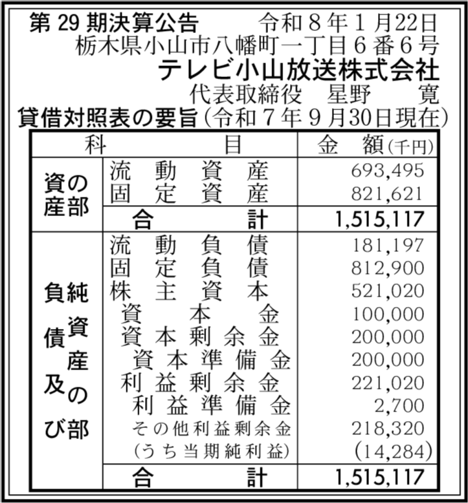 | 会社名 | テレビ小山放送株式会社 |