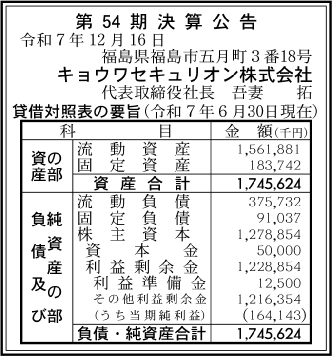 株式会社福島理化学研究所 福島県福島市 【2025年7月期】 |