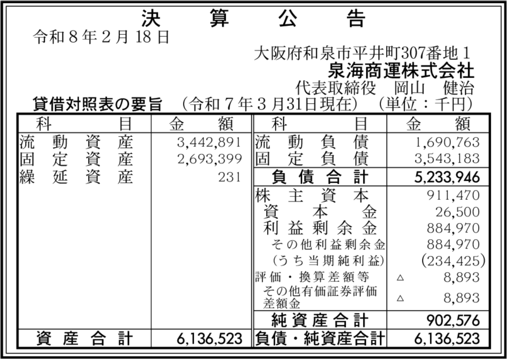 泉海商運東日本株式会社 大阪府和泉市 【2025年11月期】 |