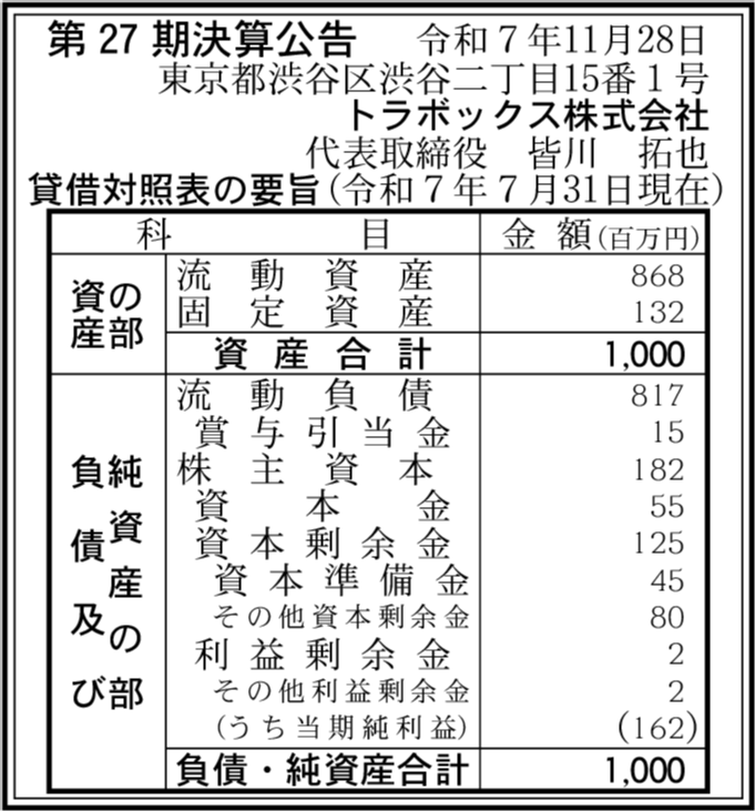 | 株式会社TRUX | 東京都渋谷区 | △1億4,900万円 (赤字拡大) |