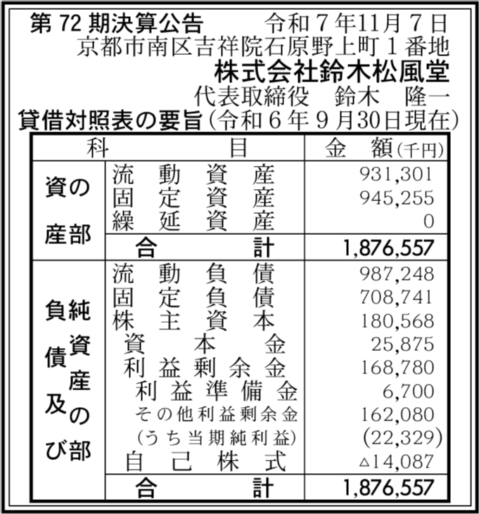 株式会社片岡製作所 京都市南区 【2025年1月期】 |