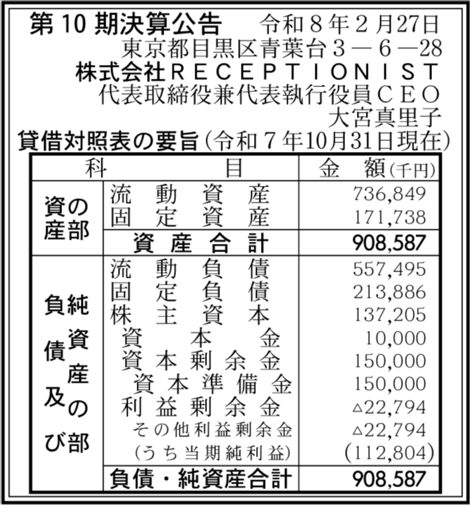 | 会社名 | 株式会社RECEPTIONIST |