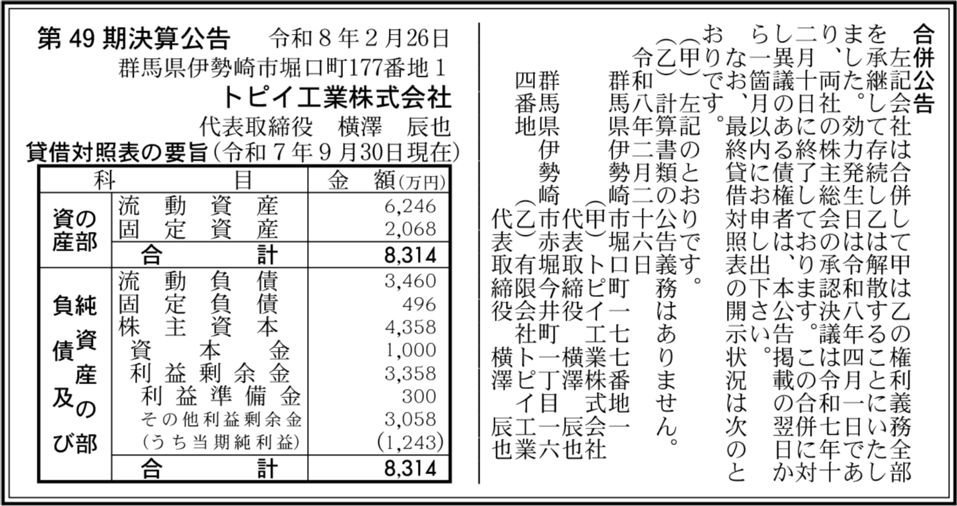 | 会社名 | トピイ工業株式会社 |