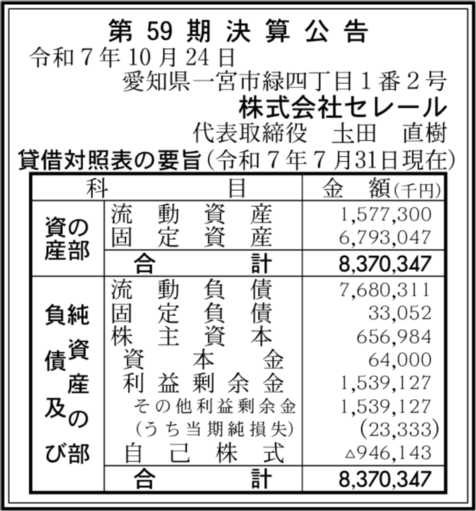 | 株式会社マリエール | 愛知県一宮市 | △210万8,000円 |
