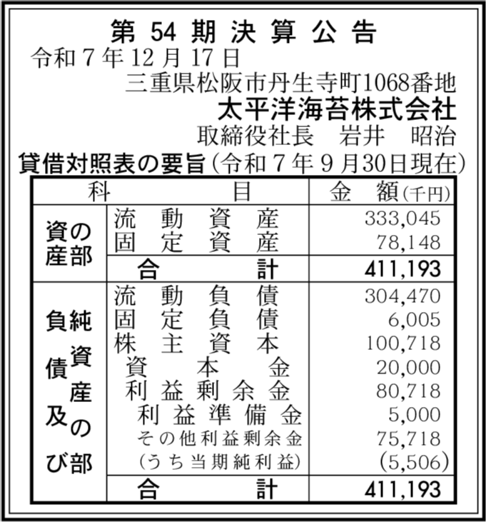 松阪岡崎産業株式会社 三重県松阪市 【2024年9月期】 |