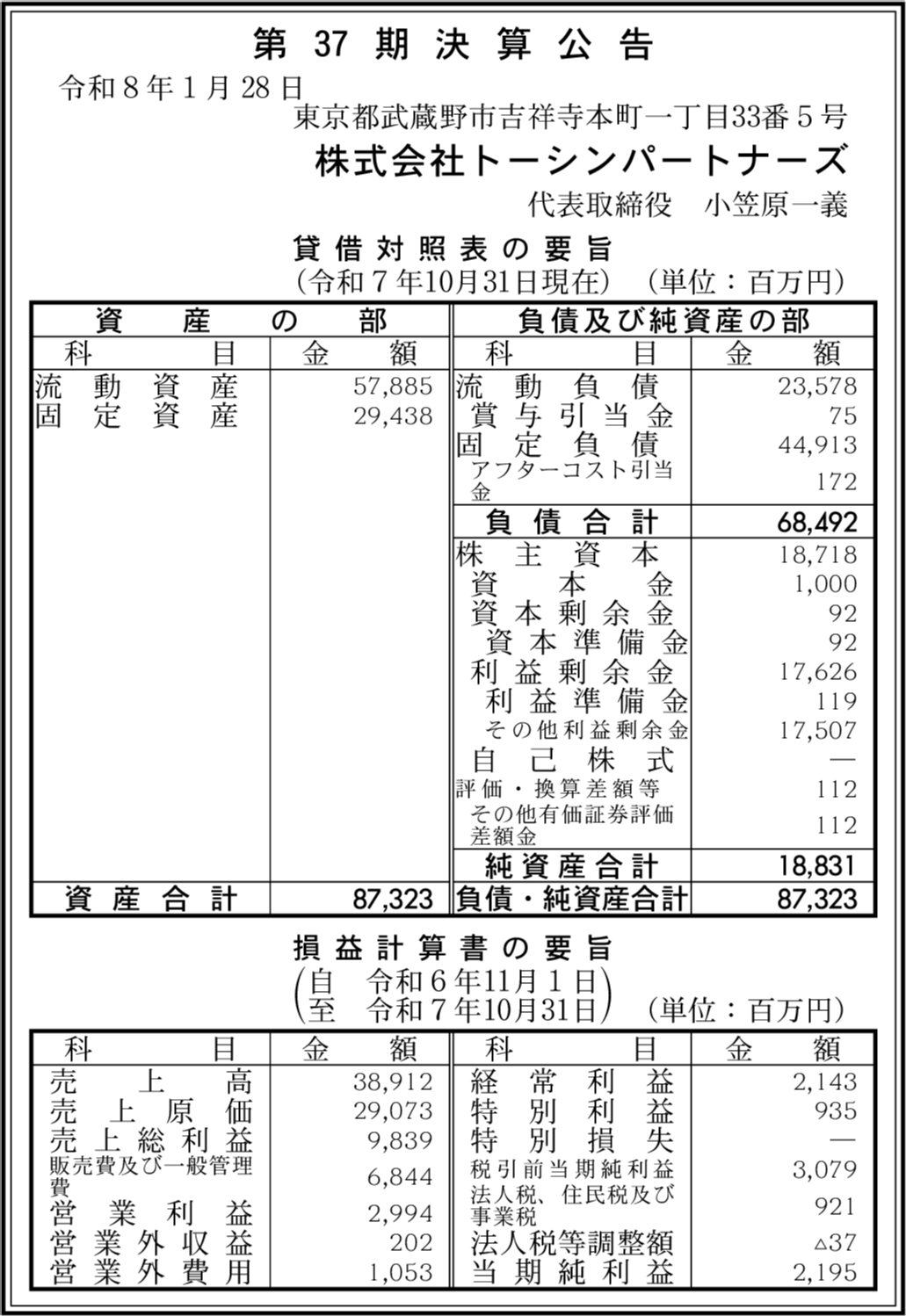 株式会社トーシンパートナーズホールディングス 東京都武蔵野市 【2025年10月期】 |