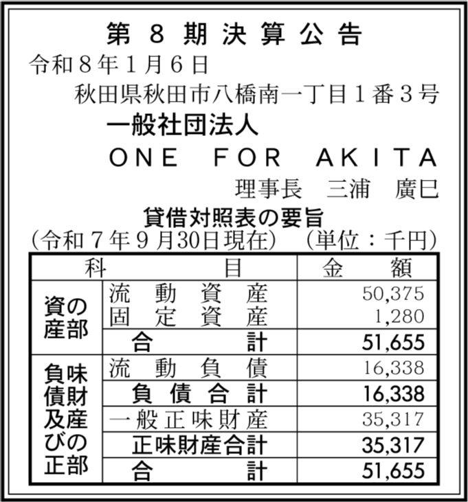| 会社名 | 一般社団法人ONE FOR AKITA |