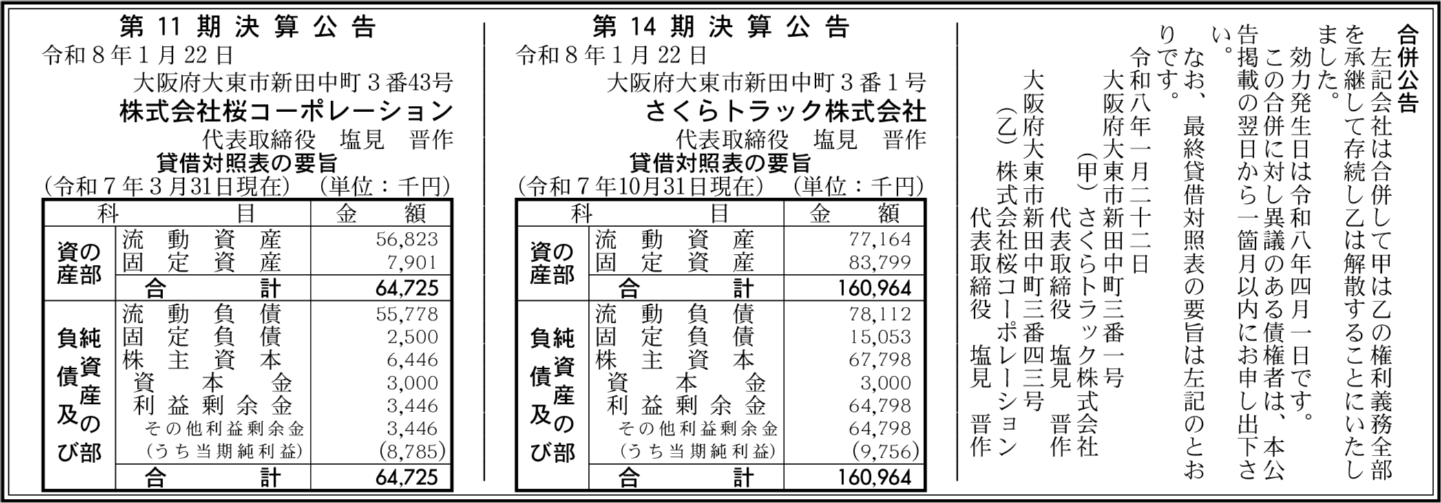 さくらトラック株式会社 大阪府大東市 【2025年10月期】 |