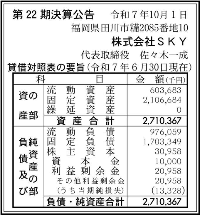 株式会社SKYファシリティーズ | 福岡市早良区 | △960万2,000円 |