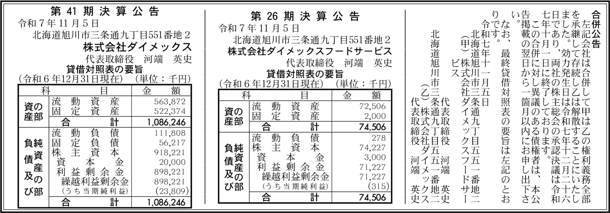 株式会社ダイメックスフードサービス 北海道旭川市 【2024年12月期】 |