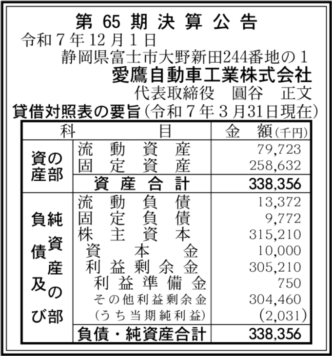 | 会社名 | 愛鷹自動車工業株式会社 |