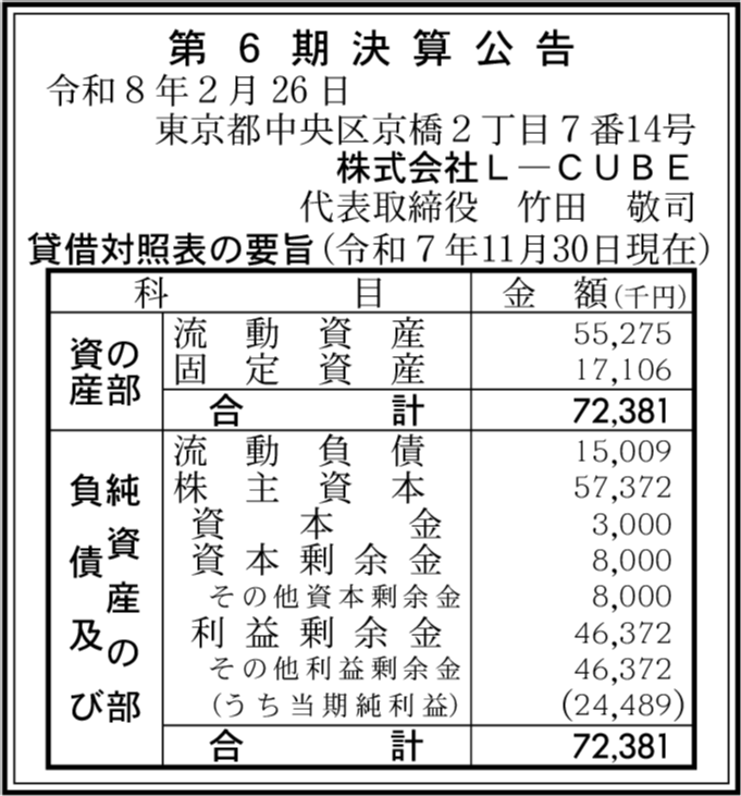 | 会社名 | 株式会社L-CUBE |