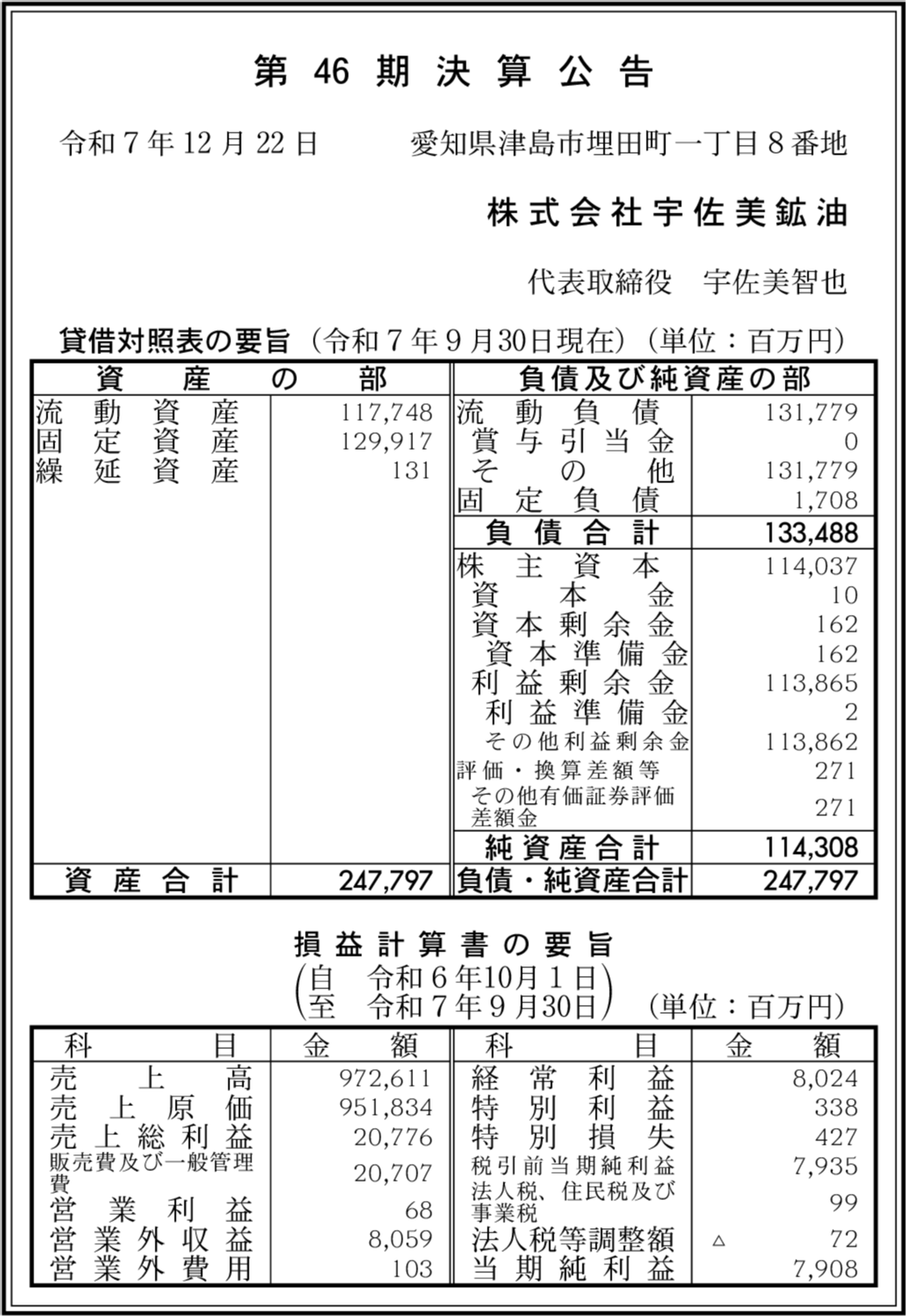 株式会社宇佐美 愛知県津島市 【2025年9月期】 |