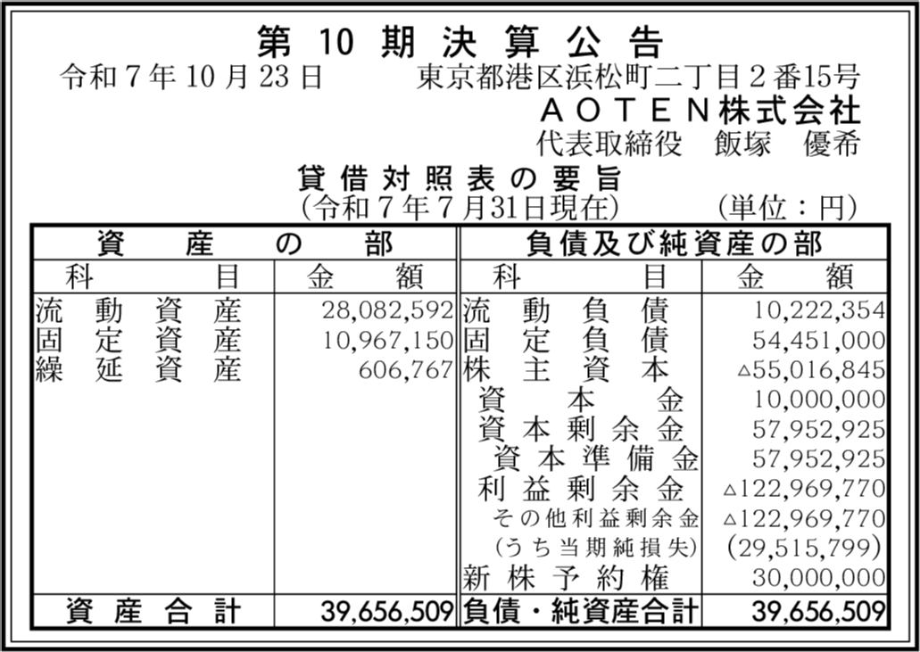 | 利益剰余金 | △1億2,296万9,770円 (赤字拡大) |