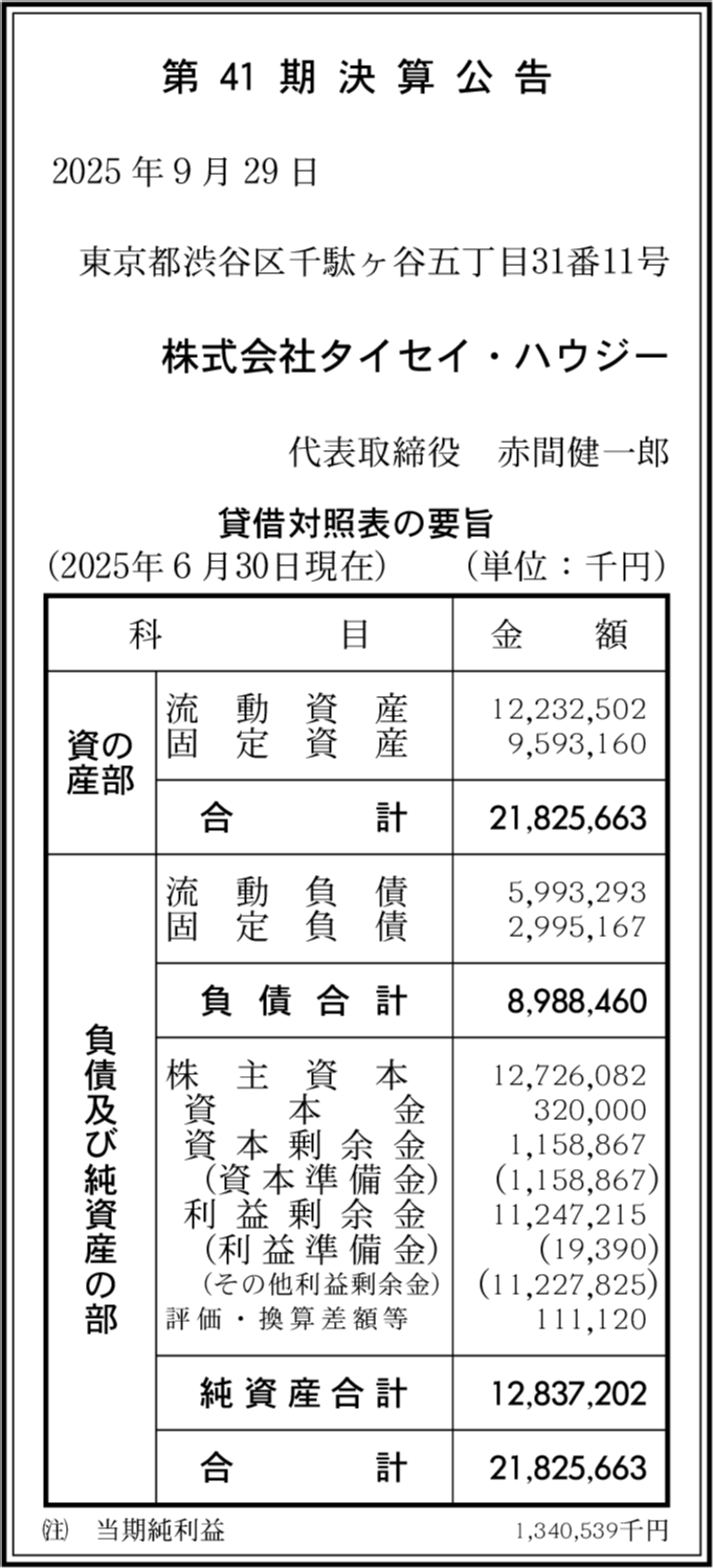 株式会社タイセイ・ハウジープロパティ 東京都渋谷区 【2025年6月期】 |